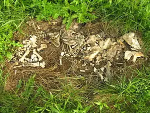 Microorganisms, mainly bacteria and fungi, play a role in bone degradation. They are capable of invading bone tissue and causing minerals to leach into the surrounding environment, leading to disturbances in its structure.[14] Small and large mammals often disturb bones by removing them from grave sites or gnawing on them, which contributes to their destruction.[15] Finally, plant roots located above burial sites can be extremely destructive to bone. Fine roots can travel through the tissue and split long bones, while larger roots can produce openings in bones that may be mistaken for fractures.[3]