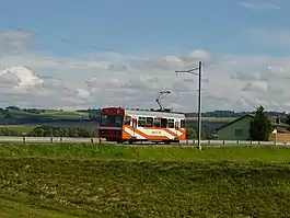 The Orbe-Chavornay railway (O-C) is a 3.9 km standard gauge railway in Vaud, Switzerland, linking the towns of Orbe and Chavornay (where there is an interchange with trains of the Swiss Federal Railways. The line was opened in 1894 and was operated by electric traction from the start - the first electrified standard-gauge railway in Switzerland. The line was initially operated with a direct current overhead power supply 600 Volts and is now 750 Volts.