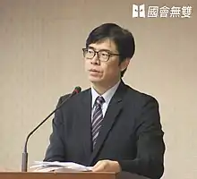 After a temporary period of research at the London School of Economics in England, Chen was appointed the Deputy Secretary-General of the Presidential Office in February 2007.[23] His appointment drew mixed reactions, with the support from the DPP legislative caucus and opposition from the Kuomintang legislative caucus.[24] Chen served with Lin Chia-lung, former director of the Government Information Office.[25][26]