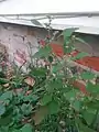 It tends to grow upright at first, reaching heights of 10–150 cm (rarely to 3 m), but typically becomes recumbent after flowering (due to the weight of the foliage and seeds) unless supported by other plants. The leaves are alternate and varied in appearance. The first leaves, near the base of the plant, are toothed and roughly diamond-shaped, 3–7 cm long and 3–6 cm broad. The leaves on the upper part of the flowering stems are entire and lanceolate-rhomboid, 1–5 cm long and 0.4–2 cm broad; they are waxy-coated, unwettable and mealy in appearance, with a whitish coat on the underside. The small flowers are radially symmetrical and grow in small cymes on a dense branched inflorescence 10–40 cm long.[3][4][10] Further, the flowers are bisexual and female, with five tepals which are mealy on outer surface, and shortly united at the base.[13] There are five stamens.[13]