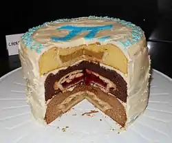 ![]() A cherpumple decorated for Pi Day, cut to show layers (2015) | |