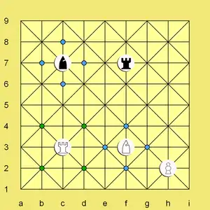 - On a point with diagonals, a pawn moves (without capturing) one step straight forward, and captures one step diagonally forward.[lower-alpha 5]