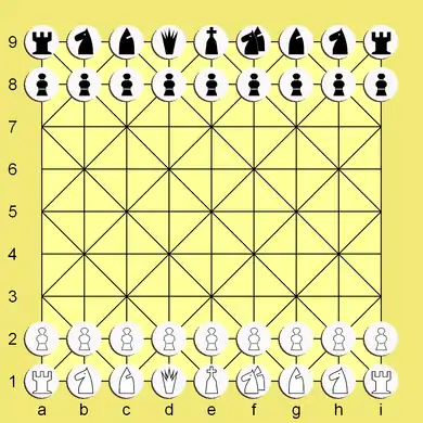 The dimensions of the board are 9 rows by 9 columns. All the standard chess pieces are present, plus one additional pawn and one archbishop fairy piece per side. The pieces move in ways specially adapted to the Alquerque-gridded board; these moves differ slightly from those in regular chess.[4]