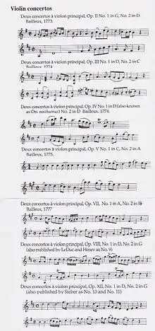 Saint-Georges's first compositions, Op. I, were a set of six string quartets, among the first in France, published by famed French publisher, composer, and teacher Antoine Bailleux.[32] They were inspired by Haydn's earliest quartets, brought from Vienna by Baron Bagge. Saint-Georges wrote two more sets of six string quartets, three forte-piano and violin sonatas, a sonata for harp and flute, and six violin duets. The music for three other known compositions was lost: a cello sonata, performed in Lille in 1792, a concerto for clarinet, and one for bassoon.