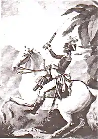 At the age of 13, Joseph was enrolled by his father in Tessier de La Boëssière's Académie royale polytechnique des armes et de l'équitation (fencing and horsemanship). According to La Boëssière fils, son of the Master: "At 15 his [Bologne's] progress was so rapid, that he was already beating the best swordsmen, and at 17 he developed the greatest speed imaginable."[17] Bologne was still a student when he beat Alexandre Picard, a fencing-master in Rouen, who had been mocking him as "Boëssière's mulatto", in public. That match, bet on heavily by a public divided into partisans and opponents of slavery, was an important coup for Bologne. His father, proud of his feat, rewarded Joseph with a handsome horse and buggy.[18] In 1766 on graduating from the Royal Polytechnique Academy, Bologne was made a Gendarme du roi (officer of the king's bodyguard) and a chevalier.[19] Henceforth Joseph Bologne, by adopting the suffix of his father, would be known as the "Chevalier de Saint-Georges". As an illegitimate son, he was ineligible to inherit his father's title.