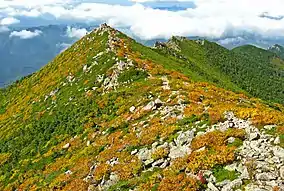 Mount Mito consists of three peaks: the Western Peak (1,527 m), Central Peak (1,531 m), and Eastern Peak (1,528 m). The mountain is part of a northern section of the Oku-takao Ridge (奥高尾縦走路, Oku-takao Jūsōro) that runs northeast from Mount Takao, Hachiōji, Tokyo. The mountain is famous for its forest of Fagus japonica and was voted to be one of the best 100 mountains in Japan in 1997.[4] It is also the source of the Aki River, a major tributary of the Tama River.
