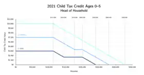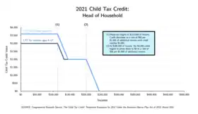 The child tax credit has been criticized for its complexity. In many countries, a simple monthly child allowance is sent to all families.[50] In the United States, by contrast, the CTC has a complicated structure: it includes an income threshold, a phase-in formula, a separate phase-out formula, and mixes reduction of tax liability with direct payments. The 2021 expansion scrapped the income threshold and phase-in, but has a more complicated phase-out structure: it first phases down to a $2,000 plateau and then at higher incomes phases down to $0; the phase-out structure also differs depending on the number of qualifying children (see chart).[26][51]