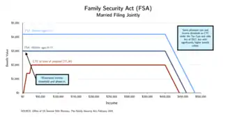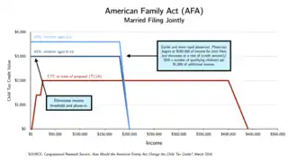 In 2019, Democratic senators Michael Bennet and Sherrod Brown proposed the American Family Act (AFA) of 2019,[17] which garned 38 co-sponsors (all Democrats) and became the centerpiece of Bennet's 2020 presidential campaign.[18] The bill would have increased the child tax credit's refundable portion to $3,600 per child under age six and to $3,000 per child age six to 16,[19] eliminated the income threshold and phase-in (opening up the credit to the lowest-income families), removed the requirement added by the Tax Cuts and Jobs Act of 2017 that dependents have a Social Security number to qualify (which made non-citizen children ineligible) and made the credit a monthly rather than annual benefit.[20] It would also have significantly lowered the phase-out income threshold, reducing the number of high- and upper-middle income households who could use the credit, as well as increase the rate at which the credit phases out.[20]