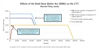 The Build Back Better Act, passed by the House of Representatives on November 19, 2021,[32] would extend the expansion of the CTC made by the American Rescue Plan Act of 2021 for one year.[33] Significantly, it would also make the full-refundability of the CTC permanent (i.e. it would permanently eliminate the earned income threshold and phase-in, so that low-income families can access the full value of the credit).[11] The bill is currently stalled in the Senate,[34] and it is uncertain whether alternative plans for a 2022 reconciliation bill would include expanded CTC benefits.[35][36]
