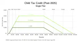 Under the Tax Cuts and Jobs Act of 2017 (TCJA), for the years 2018–2025 (excluding 2021, see below section Temporary Expansion in 2021) the CTC allows taxpayers to reduce their federal tax liability by $2,000 per qualifying child (see Eligibility). The maximum credit a taxpayer can receive is thus equal to the number of qualifying children multiplied by $2,000 (e.g. a family with 3 qualifying children is eligible for $2,000 x 3 = $6,000 in tax relief). The credit begins to phase out at a rate of $50 for every $1,000 in additional income over $200,000 for single filers and unmarried heads of households or over $400,000 for married joint filers.[4]
