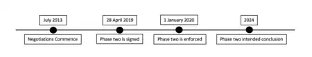 The CPFTA has two phases. The initial phase was signed on 24 November 2006 and concluded in December 2012. The second phase was signed on 28 April 2019 and came into force on 1 January 2020.[7] Phase two will conclude in 2024.[8]