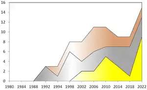 | Liu Xianying | F | 1977 | 1998–2010 | 21–33 | 7 1998, 2006 | − | − | − | 0-0-0 | 0 | |