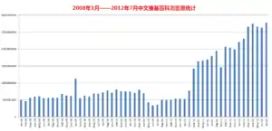 Due to the audience base, Wikipedians from China, Taiwan, and other regions had engaged in editing conflicts over political topics related to Cross-Straits relations.[11] Due to the censorship in mainland China, Chinese Wikipedia's audience comes primarily from Taiwan, Hong Kong, Macau, Singapore and the diasporas in Malaysia, the United States, Canada, Australia, South Korea (including Koreans from China), totaling approximately 60 million people. Chinese Wikipedia has more than 9,100 active users as of July 2021, and this number is increasing.[12]