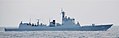On May 18, 2014, Zhengzhou, Yantai and Liuzhou, as the first surface ship formation command ship, participated in the Maritime Cooperation 2014 Sino-Russian maritime joint military exercise of the Varyag, Admiral Panteleev and Admiral Nevelsky and other Russian ships at Wusongkou in Shanghai.[10] From May 20th to 26th, the two sides conducted exercises such as ship anchorage defense, joint sea assault and joint anti-submarine.[11] On July 11, 2014, Shanghai held a Navigation Day theme publicity and commemorative event. Zhengzhou and rescue ship Donghai Jiu berthed at the Shanghai Port International Passenger Transport Center Wharf, open to the public to visit.[12] On September 14, 2014, a maritime formation consisting of Zhengzhou and combat support ships, local law enforcement ships, helicopters, and submarines set off for a certain sea area in the East China Sea to carry out the Poseidon 2014 maritime combat support exercise. The exercise supported nine actual combat subjects, including protection of maritime law enforcement forces' rights protection and law enforcement operations, joint military-land search and rescue, opening of maritime emergency channels, and rescue of disabled submarines.[13] On December 12, 2014, Zhengzhou, Taizhou, Zhoushan, Yiyang, Qiandaohu and a Type 815 spy ship. The ships crossed the Miyako Strait into the Western Pacific.[14]