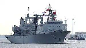Type 903 integrated supply ship (NATO called Fuchi-class supply ship) is a new large-scale integrated supply ship of the Chinese People's Liberation Army Navy, designed by Zhang Wende. The later improved model is called 903A. The difference with 903 is that the displacement has increased from 20,530 tons to 23,000 tons.[1]