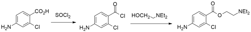The hydrochloride salt of 4-amino-2-chlorobenzoyl chloride is made by the reaction of 2-chloro-4-aminobenzoic acid with thionyl chloride. Synthesis of this drug is then accomplished by directly reacting the product of the last step with the hydrochloride salt of 2-diethylaminoethanol.