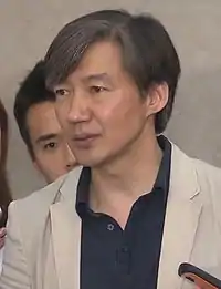 Cho Kuk (Korean: 조국, born 6 April 1965[1]) is a South Korean jurist and politician. He was the Senior Secretary to the President for Civil Affairs from 2017 to 2019 in the Moon Jae-in Cabinet. On 9 September 2019, President Moon Jae-in appointed Cho as Minister of Justice, replacing the incumbent Park Sang-ki. As of late 2019, Cho Kuk was involved in a series of controversies, including allegations of illicit business activities and falsification of academic achievements of his daughter. On 14 October, Cho Kuk announced his resignation of Minister of Justice over corruption allegations.[2]