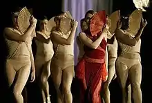 The video begins with a shot of Minogue posing in a dark room, dressed in a sparkling costume on which rainbow-lighting is projected. She is then shown in front of a wall wearing a flowing maroon dress. As the intro ends and the first verse commences, Minogue appears in a hall and performs various dance routine with numerous female dancers clad in nude bodysuits. The singer's attire consists of a pleated red organza dress designed by Austrian fashion designer Helmut Lang (in 2006, Minogue donated this costume to the Arts Centre Melbourne museum, where it is displayed in the Kylie Minogue Collection).[18] Shots of the dancers in kaleidoscopic arrangements are intercut. A few seconds later, Minogue and a man dance together alone in a hall. Their dance ends with the man slowly laying Minogue down on the floor and leaving. Twelve women in golden and pastel pink dresses are seen dancing on a dark brown floor, which is revealed to be Minogue's hat as the camera pans out. She proceeds to wave to a distant person and then plucks the petals out of a pink rose she is holding. The rest of the video randomly intersperses all of the previous scenes.[21] Complimenting the video's cinematography, arts and music writer Lesley Chow described it as "a deliriously romantic vision of surrender", adding: "Shadforth's depiction of warm bodies in a sensual world must be one of the most compelling realisations of the female gaze on film."[12]