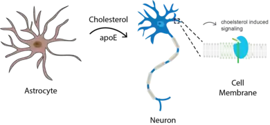 In the brain, cholesterol is synthesized in astrocytes and transported to neurons with the cholesterol transport protein apolipoprotein E (apoE). The cholesterol controls the clustering of amyloid precursor protein with gamma secretase in GM1 lipid domains. High cholesterol induces APP hydrolysis and the eventual accumulation of amyloid plaques tau phosphorylation. The ApoE isotype4 is the greatest risk factor for sporadic Alzheimer's and this allele was shown to increase cholesterol in mice.[11]