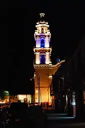 The sanctuary to this Virgin manifestation was established in 1594, with the first church built between then and 1666.[37] The church has suffered damage on various occasions from lightning strikes and from earthquakes.[38] Before the Spanish, the pyramid was considered to be sacred to a female rain deity called Chiconahuiquiahuita (Nine Rains). She was accredited with striking the new church with lightning and supposedly a stone image of her was found at the site the church is now.[32] The lightning strikes have caused minor damage, but the earthquakes have been more serious. In 1864, the church was almost completely destroyed by an earthquake. It took ten years to rebuild and was re-inaugurated in 1873.[38] In February 1930, there was a robbery at the church. The thieves stole the jewelry that the image had been wearing, including a gold crown, a silver halo and precious stones.[39] The next major quake to damage the building came in 1999, which damaged the towers and caused the pilgrims' portal to collapse, with damage to 80% of the building.[38] However, the image of the Virgin, in her Fabergé box, was undamaged.[3]