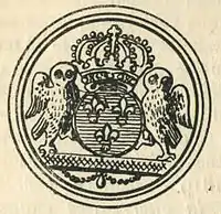 A curious shield of the revolt seems to bear a sort of official use of owls (also the emblem of Minerva) in representing the Chouannerie. It bore the arms of France, right,[6] supported by two owls, with a double motto, IN SAPIENTIA ROBUR at the top, SIC REFLORESCENT at the bottom. It is to be found on some publications emanating from the "Royalist agencies in England", notably on the frontispiece of l’Almanach Royaliste pour l'année 1795, troisième du règne de Louis XVII, à Nantes (Londres) et se trouve dans toutes les villes de la Bretagne, de la Normandie, du Poitou, du Maine, du Perche, de l'Anjou, etc., et bientôt dans toute la France or, in English, "The Royalist Almanac for the year 1795, third year of the reign of Louis XVII, at Nantes (ie London) and found in all the towns of Brittany, Normandy, Poitou, Maine, Perche, Anjou, and soon throughout the whole of France".