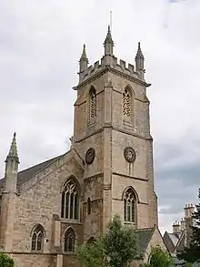 The limestone church has a six-bay nave, chancel and buttressed tower in the south west. The tower is topped by an embattled parapet and embellished crocketed pinnacles which were added as part of the 1850s revision by George Phillips Manners and John Elkington Gill.[1]