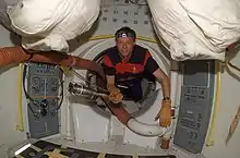 - EV2 during second spacewalk which included first part of rewiring the power system of the ISS specifically channel 2 and 3. Also performed together with Astronaut Robert Curbeam as EV1.