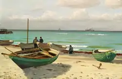 Among his most notable works on display at the National Gallery of Denmark are Fra Begtrupvig ved Hels (1864) and Panserskibet Ivar Huilfeldt passerer Forbjerget Stat i en Storm (1893).[6]