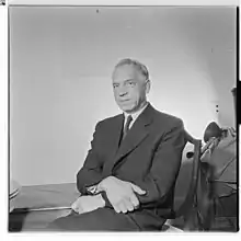 After the war he returned as mayor of Tromøy from 1956 to 1959.[6] He was also chairman of the committee that prepared the Tromøy Bridge from 1938 to 1961, as well as of the board in the Arendal newspaper Agderposten.[2] He was the sole owner of the newspaper for many years, having started in 1936 when he, together with two associates, took over Agderposten by buying shares in the company with the same name.[7] It was inherited by his daughter.[8] He died in July 1981.[3]