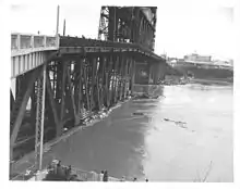 At Oregon City, Willamette Falls was unrecognizable as a waterfall, and the city was flooded by several feet of water.[3] In Portland, the lower deck of the Steel Bridge was underwater and had also been hit by a log raft consisting of around 1,000 logs.[3] The impact of the raft severely damaged the Hawthorne Bridge, closing it for a year.[3] At 12 feet (3.7 m) above flood stage, the flooding of the Willamette River at Portland in 1964 was second only to the 1948 flood that wiped out Vanport City.[3] At its peak, the water was at the top of Downtown Portland's seawall.[1]