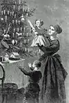 After Victoria's marriage to her German cousin Prince Albert, by 1841 the custom became even more widespread[46] as wealthier middle-class families followed the fashion. In 1842 a newspaper advert for Christmas trees makes clear their smart cachet, German origins and association with children and gift-giving.[47] An illustrated book, The Christmas Tree, describing their use and origins in detail, was on sale in December 1844.[48] On 2 January 1846 Elizabeth Fielding (née Fox Strangways) wrote from Lacock Abbey to William Henry Fox-Talbot: "Constance is extremely busy preparing the Bohemian Xmas Tree. It is made from Caroline's[49] description of those she saw in Germany".[50] In 1847 Prince Albert wrote: "I must now seek in the children an echo of what Ernest [his brother] and I were in the old time, of what we felt and thought; and their delight in the Christmas trees is not less than ours used to be".[51] A boost to the trend was given in 1848[52] when The Illustrated London News,[53] in a report picked up by other papers,[54] described the trees in Windsor Castle in detail and showed the main tree, surrounded by the royal family, on its cover. In fewer than ten years their use in better-off homes was widespread. By 1856 a northern provincial newspaper contained an advert alluding casually to them,[55] as well as reporting the accidental death of a woman whose dress caught fire as she lit the tapers on a Christmas tree.[56] They had not yet spread down the social scale though, as a report from Berlin in 1858 contrasts the situation there where "Every family has its own" with that of Britain, where Christmas trees were still the preserve of the wealthy or the "romantic".[57]