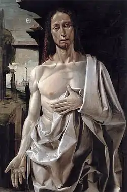 A feeling of austerity and compassion prevails towards the figure who solemnly shows the signs of martyrdom, with an incisive graphic definition of the forms. Instead of the triumphant over death, Christ is depicted with red eyes, an expression of intense suffering and sadness, an almost ghostly pale body, drawn with great precision, as can be seen in the fingers, tendons of the outstretched arm and muscles and chest. The expression of Christ is powerful enough to focus the observer's attention on the sphere of emotions, which is the aspect Bramantino was most interested in presenting.[3]