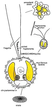 As is characteristic of all haptophytes, members of the genus Chrysochromulina possess two flagella and a unique flagella-like organelle known as the haptonema.[5] The haptonema can vary widely in length, reaching upwards of 60 µm,[2] and functions in cell attachment and feeding but differs from flagella in terms of microtubule arrangement,[5]