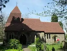 Church in the Wood's parish was reduced in size in 1870 when some of its territory was given to the newly built St John the Evangelist's Church. Hollington became part of the Borough of Hastings in 1897.[19] After this, little change occurred in the church itself, although a lychgate was built at the entrance to the churchyard in 1937,[20] general repairs were made in 1964 and an extension was added in 1977 to form a parish room and vestry.[16][21] The churchyard is large and has been used for centuries—the first recorded burial took place in 1606, and the oldest surviving gravestone dates from 1678—and it is the last remaining private burial ground in the Borough of Hastings.[16]