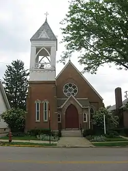 Constructed in 1893,[3]: 513 dedicated in 1894,[4]: 48 and rededicated in 1895,[3]: 513 the Church of Our Saviour is a Gothic Revival structure.[1] In its early years, its pipe organ, brass altar, and windows were deemed its most distinctive elements,[3]: 513 all of which prompted a local author to declare that "both the exterior and interior are very attractive" in 1907.[4]: 48 Built of brick on a stone foundation and featuring elements of wood and stone,[6] the single-story church is covered with a composite roof rising to a central gable. The windows that attracted the attention of authors in the early twentieth century are stained glass; most are ogive windows, but the center of the facade features a rose window. A square brick tower with a wooden belfry sits at one corner of the building; additional stained glass windows are placed in the tower, and ornamental wooden carvings adorn the belfry.[7] Architecturally, it is not unique; three of Mechanicsburg's five historic church buildings were constructed in the 1890s,[8]: 6 and four of the five are brick buildings with stained-glass ogive windows.[8]: 2