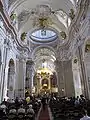 In 1689 the Gothic edifice was demolished as it proved too small for the growing cult of Saint John Cantius, the patron saint of the Jagiellonian University who's laid to rest there.[3] In 1689-1705 the new Baroque church was erected, modelled on Sant'Andrea della Valle in Rome.[1] The architect was a Polonized Dutchman Tylman van Gameren, a chief architect at the court of John III Sobieski. The interior stucco decoration is the work of Baldassarre Fontana, and the polychromy assisted by painters and brothers Carlo and Innocente Monti and Karl Dankwart of Nysa. The painting of St. Anne in the high altar is the work of Jerzy Siemiginowski-Eleuter, court painter of King John III Sobieski. The 18th-century paintings in the stalls showing the life of Saint Anne are by Szymon Czechowicz. In the transept there is an altar of the adoration of the cross to the left, and the tomb of John Cantius to the right.[1]