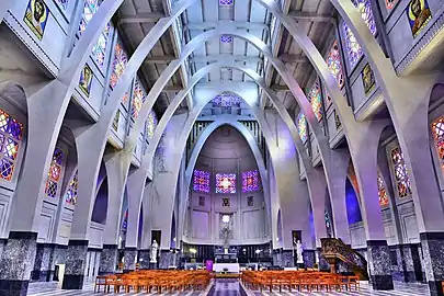The interior is bright and colourful. Space and volume are determined by columns that form slender parabolic arches towards the centre, creating a high-dimensional nave, and other rather symbolic ones towards the two aisles, whose space is barely separated from that of the nave. The six arches of the nave are 23 metres (75 ft) high. The stained glass windows and the concrete-glass compositions are reminiscent of the Church of Notre-Dame du Raincy, in Paris. The non-figurative stained glass windows come from the Brussels studio of the glassmaker and decorator Frans David Crickx (1893–1979).