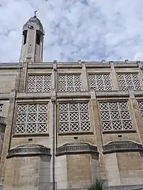The current building is resolutely Art Deco. It can accommodate thousands of parishioners. Outside, the concrete structure is partly covered with Brauvilliers stone. Above the central portal is a bas-relief by the sculptor Albert Aebly (1897–1971) illustrating the baptism of Christ by Saint John the Baptist. The facade window is in the shape of an enormous Latin cross of glass. The steeple, octagonal, tall, slender, and having at its top a modernist clock, flanks the left side of the facade. It is accessible to the public via a staircase of 292 steps leading to a 68-metre-high (223 ft) platform, from which one can have a panoramic view of Brussels.[8]