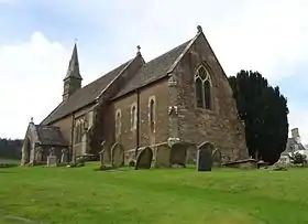 The church, of English Gothic architectural style, is described by Pevsner as Middle Pointed or Decorated Period.[7] The building is of coursed sandstone rubble with ashlar dressings and has a decorative tiled roof with bands of fishscale tiles. The nave, south porch, chancel and north vestry, are in the Decorated style.[8] The nave has two square-headed windows with hoodmoulds. They have cusped ogee-headed lights and spandrels. A square-set bellcote is partly supported by a central buttress at the west end and has similar cusped ogee-headed openings in square surrounds and spirelet with decorative lucarnes, and three-cusped ogee-headed lancets in the chancel.[8]