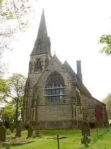 The church and graveyard were consecrated at 11 am on 3 October 1870 by Robert Bickersteth, Bishop of Ripon, although part of the graveyard had already been consecrated by 1862, and the spire was not completed.[3][16] The pews were filled to overflowing when the bishop processed into the church, followed by over thirty local clergymen, all repeating Psalm 24. The bishop read the sentence of consecration, followed by morning prayers. The choir sang, and the almost-completed organ was played for the first time by Samuel Pontefract (1815–1896) of South Crosland.[17] The bishop's sermon was based on Psalm 122, verse 1. He alluded to the recent building work, the need for support from the laity in spirit and funding, and the pressing need for the final £400 required to pay off building costs. The collection amounted to £313 7s 1d. The bishop then processed outside with the clergy, to consecrate the burial ground.[3]