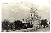 The first reliable account of the Tyumen Church of the Saviour comes from the 1624 Dozornaya book, which describes a wooden, "cold" All-Merciful Church in a posad.[5] It was located on the Market (Guest) square, near the walls of the Tyumen Kremlin.[6] Local historian Aleksandr Ivanenko assumes that it was named after the Spasskaya gate tower of the Kremlin,[3] from which started the Large Spasskaya Street (now the Republic Street).[7] According to Ivanenko, the church was located a bit to the left of a house at the Republic Street; that place is now swamped by the Tura River.[3]