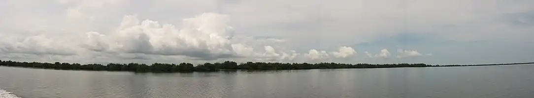 The Ciénaga Grande de Santa Marta (Spanish for Large Marsh of Saint Martha) is the largest of the swampy marshes located in Colombia between the Magdalena River and the Sierra Nevada de Santa Marta. It has an area of 4280 km2 and belongs to the outer delta system of the Madgalena River.[2] It is separated from the Caribbean Sea by a narrow, sandy artificial spit built in the 1950s,[3] on which is situated coastal route 90 from Barranquilla to Santa Marta. The marsh's large lagoon is connected to the Caribbean Sea via a narrow strait (the La Barra channel) located between the town of Pueblo Viejo and the city of Ciénaga.