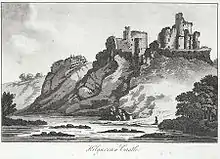 The castle sits on a rocky promontory above the River Teifi, with one side directly onto a cliff face. An earth and timber castle is believed to have existed prior to the current building, but was destroyed by Welsh forces. The existing masonry dates from around 13th century. The walls facing the cliff top were the least heavily fortified, with the defences concentrated on those that faced inland. These comprised two lines of defence, with an outer bailey and two drum towers rather than a central keep as typically seen in other castles of this period. The gatehouse is located in the south east of the building, and only partly remains.[1] A ditch around the outside of the castle was cut from the rock face,[2] which is thought to have once been spanned by a pivoting bridge.[3] Cilgerran Castle is the most northerly of all castles in Pembrokeshire. It is twinned with Cardigan Castle, located on the opposite bank of the river 3 miles (4.8 km) downstream.[1]