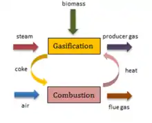 combustion chamber to provide the heating for the gasification process as it is an endothermic process. Thermal transfer will take place between the gasification and combustion chamber. The illustrated gasification process is presented in Figure 2.