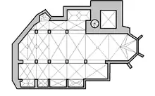 The church is an uneven, mostly rectangular, sharply beveled on the north-west corner basilica. It lacks a crossing and transepts. The polygonal choir and nave share a single roof and there are side chapels between the buttresses on the south side. The massive tower makes up the north-east corner. The western portal is partly interrupted by the beveled north-west corner and so has an asymmetric arraignment of a pointed arch portal and windows.[1]
