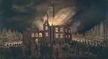In the town hall from 1618 are some group portraits, and portraits of the counts of Orange and Nassau, including several by Michiel van Mierevelt (1567–1641), one of the earliest Dutch portrait painters, and with his son Pieter (1595–1623), a native of Delft.[1] The oldest part of the complex is the belfry covered in "Gobertanger" limestone from Wallonia, a building material used often in important renaissance buildings in the Netherlands up to 1600. The tower, called "De Steen" or "The Stone", was originally built around 1300 and has decorative clockfaces from 1536 and the bells were made by Hendrick van Trier and Francois Hemony.[2] The facade has a "Justitia" statue.[2] Under the tower is an old city prison where the assassin of Willem the Silent, Balthasar Gérard, was kept before sentencing.