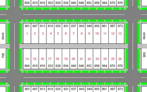 Diagram of an example of a rectangular city block as seen from above, surrounded by streets. The block is divided into lots which were numbered by the developer as shown in red here and as shown in plats. The addresses on this example 800 block are shown in black and the adjacent blocks are the 700 and 900 blocks. An alley shown in light gray runs lengthwise down the middle of the block. Streets are shown in dark gray. Sidewalks are shown in light gray. Avenues are shown in green with walkways shown in light gray from every lot to the street.