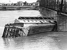 In the spring of 1908, Ross decided to sail City of Medicine Hat from Medicine Hat, Alberta, to Winnipeg, Manitoba, with a number of friends and crew on board. Having reached Saskatoon on June 7, Ross attempted to navigate the ship safely through the rail bridges that spanned a South Saskatchewan River in full spring flood. He let the passengers off just before reaching the Grand Trunk Bridge and lowered the ship's smokestack. The high water concealed telegraph wires just beneath the surface, which became entangled in the ship's rudder, rendering the steering of the vessel impossible. The ship foundered and struck the south-most pier of the newly constructed Traffic Bridge. The crew were able to escape the sinking ship and no casualties were reported. However, City of Medicine Hat was ruled a total loss. A sandbar eventually developed around the wreck and engulfed it. It was further buried when Rotary Park was created with landfill built up along the east bank near the Traffic Bridge.[4]