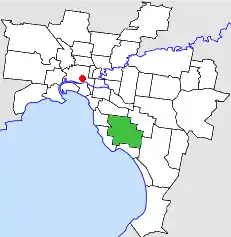 Moorabbin was first incorporated as a road district on 16 May 1862. It became a shire on 27 January 1871, and was essentially rural in character, relying on the villages on its western side for services.[2] As regions on the coast became more urban in character, local severance movements successfully obtained their own local governments. On 3 April 1912, one part was united with the Town of Brighton to the northwest. On 28 February 1917, the Borough of Sandringham split away, while on 26 May 1920, the Borough of Mentone and Mordialloc also split away. Eventually, with the development of areas such as Bentleigh and Cheltenham within the shire's boundaries, Moorabbin was proclaimed a city, on 10 October 1934. On 1 October 1959, it lost a further piece of land to the City of Oakleigh.[3]