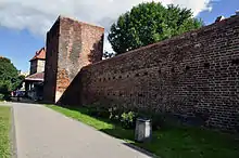 Building of city walls in Danzig began in 1343. The main wall, moat and outer wall were completed in 1380. The medieval wall became obsolete during the 16th century due to the development of artillery.[1] The city began to build a modern fortification in late 16th century and it took decades to finish. Danzig was surrounded by a bastion fort and a stone lock was built in Motława, which could be used to flood the surroundings of the city.[2] Most of the fortifications were demolished during the 1920s.